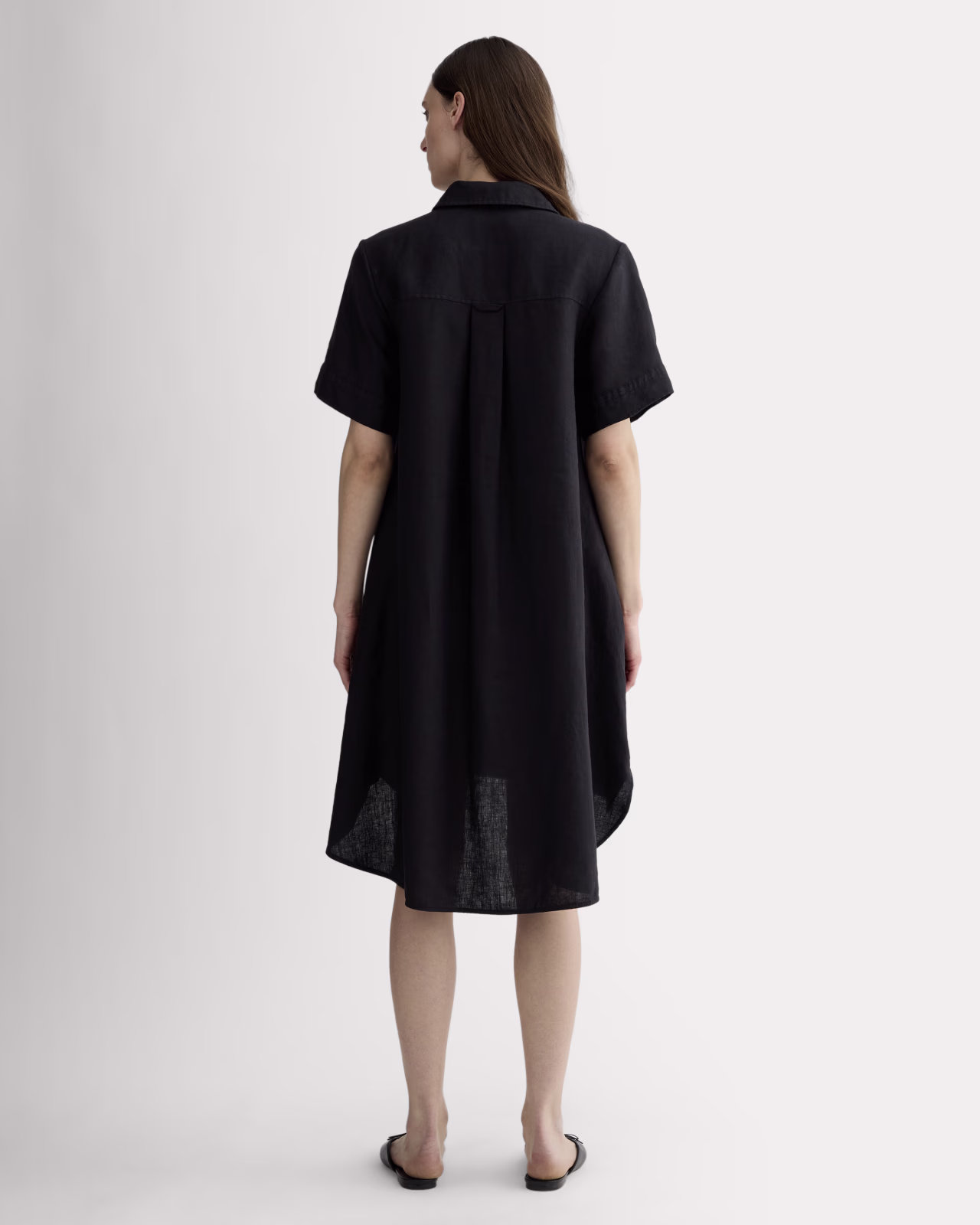 This piece features an oversized fit, point collar, button-front closure, chest pockets, short sleeves, and high-low hem.